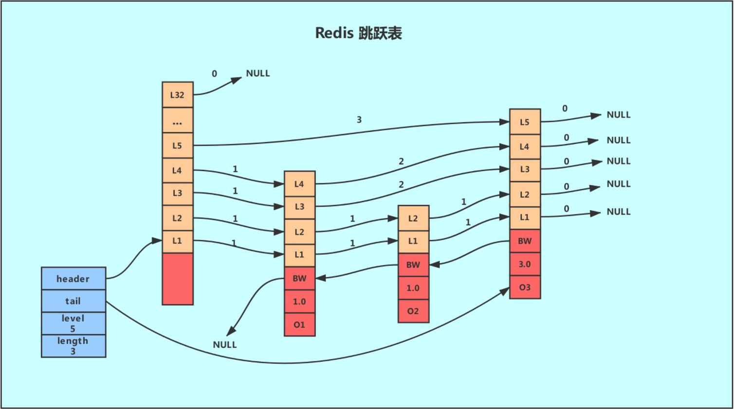 注意:有序集合(zset)的跳跃表实现中,同时使用了跳跃表和字典!