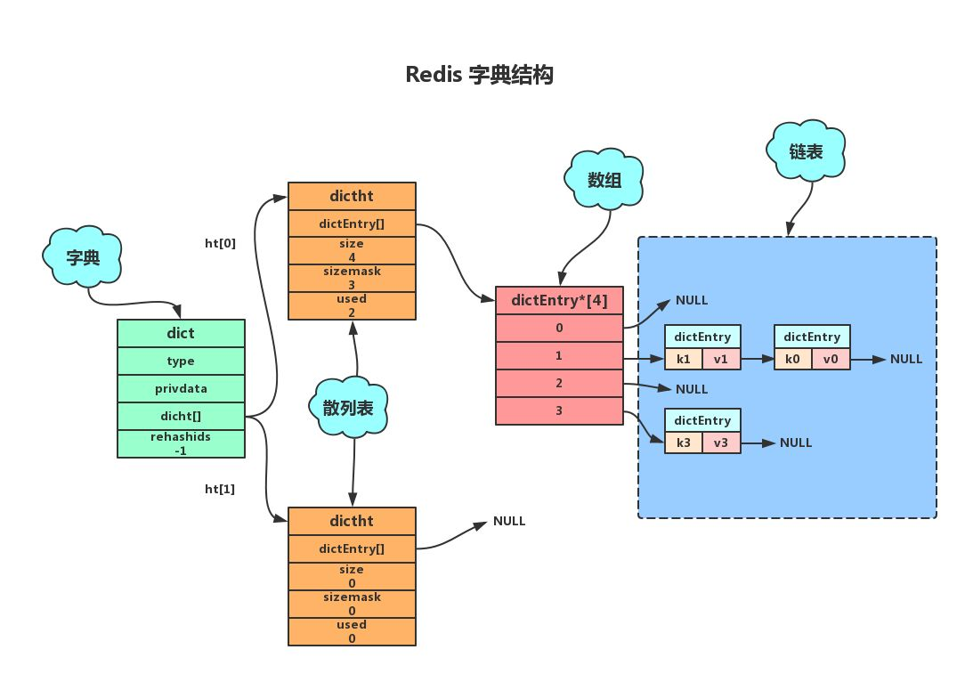 dict(字典) -> dictht(dict hash table,也就是哈希表)-> dictEntry(哈希表节点)
